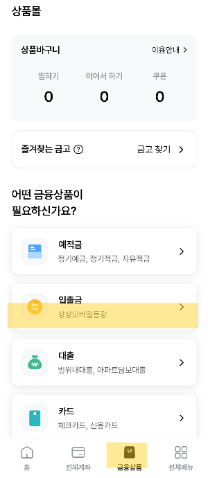 - MG더뱅킹 앱 하단 금융상품 클릭 → 입출금 '상상모바일통장' 클릭